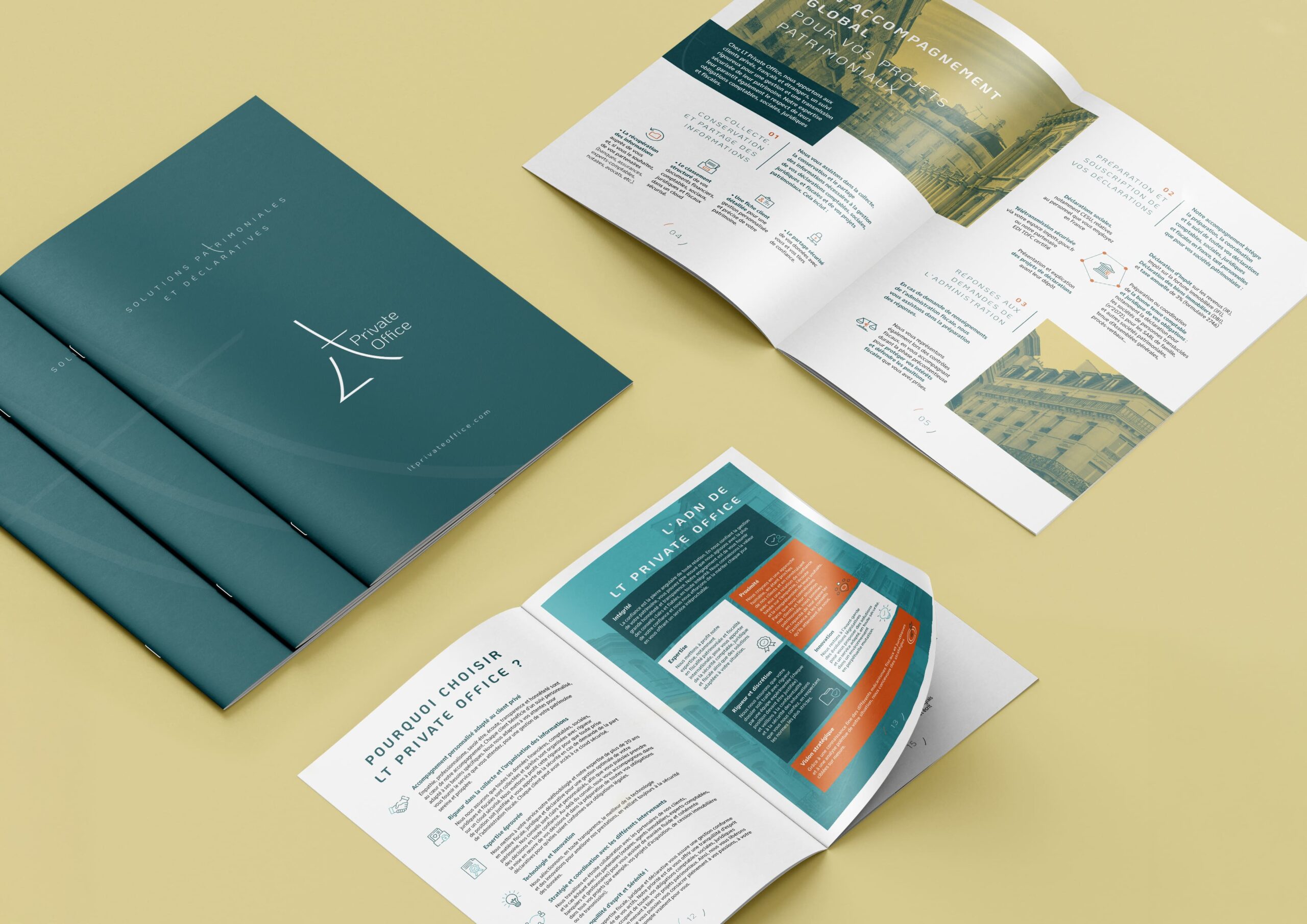 Pour la création de la brochure LT Private Office, nos clients souhaitaient s’éloigner du simple document commercial. Il s’agissait de créer un bel objet, à l’image du cabinet : personnalisé, expert, sécurisant. Dans un premier temps, nous avons proposé une maquette et un chemin de fer. Ensuite, nous avons assuré la conception, la direction éditoriale et la rédaction complète des contenus, avec une ligne de conduite : être accessible sans être simpliste, précis sans être technocratique. L’iconographie, la structure en rubriques et les témoignages renforcent cette idée d’un accompagnement global, humain et hautement qualifié.