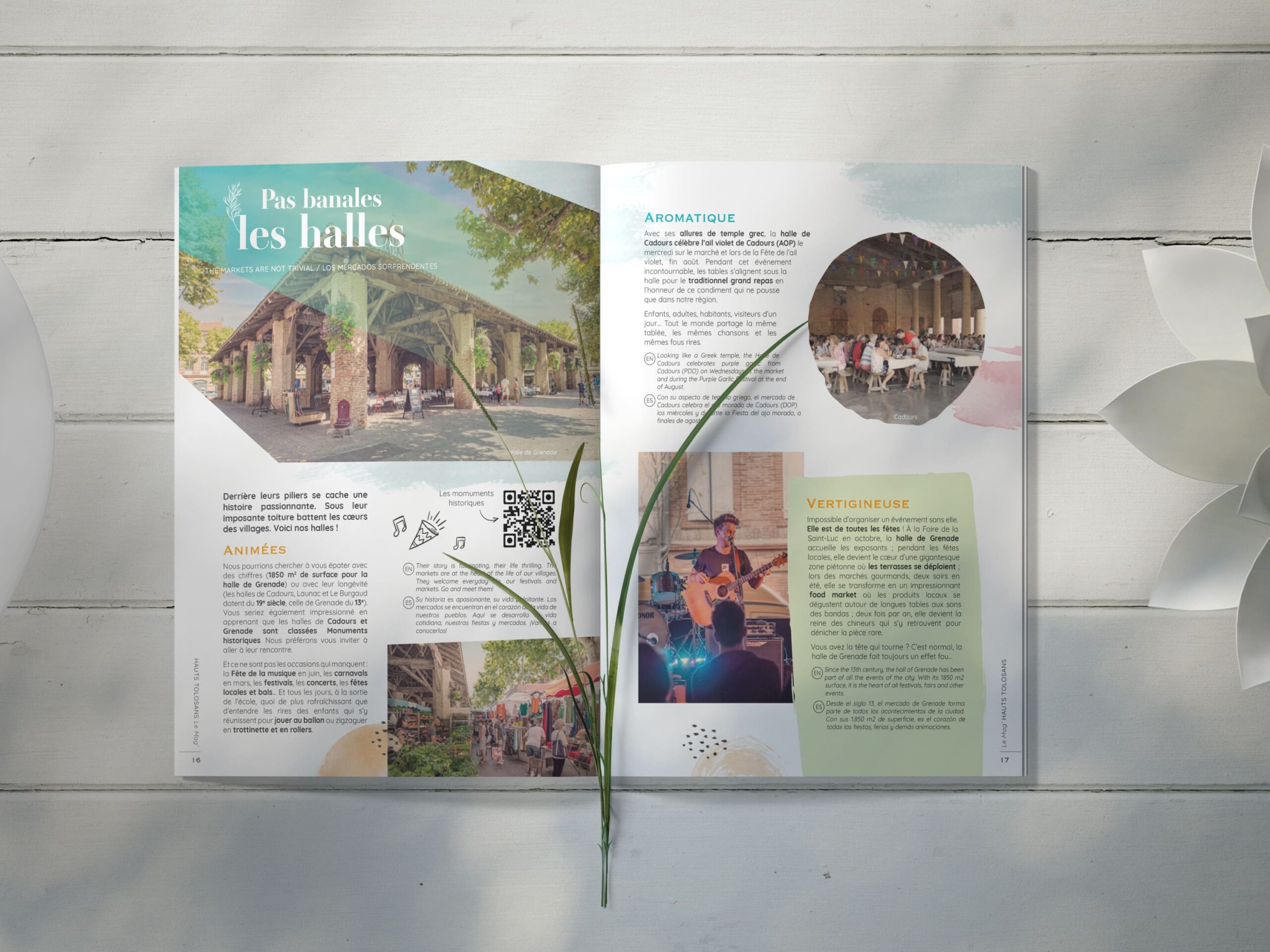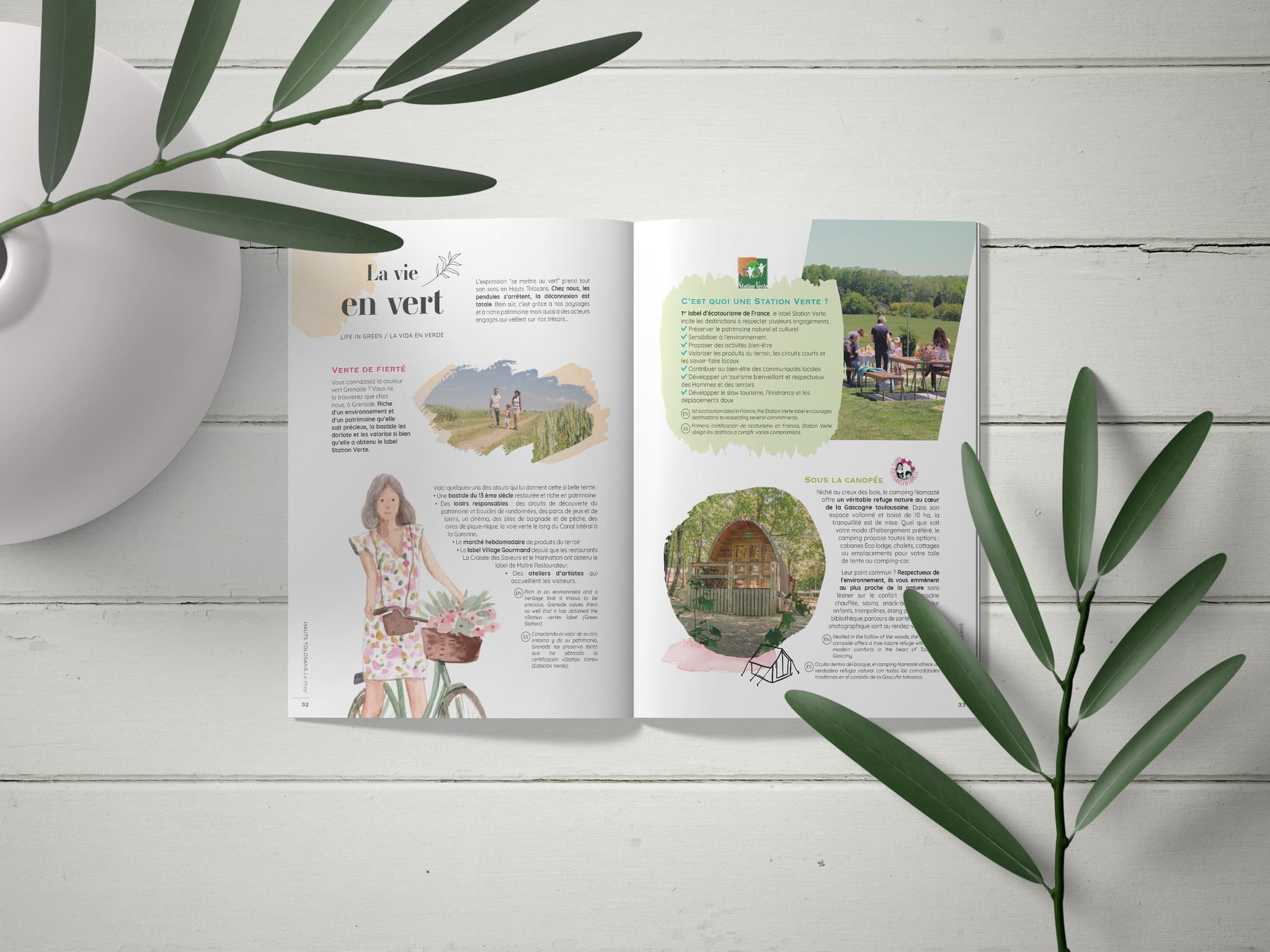 La ligne graphique a été imaginée avec des couleurs qui s’inspirent des paysages des Hauts Tolosans. Nous avons également intégré une dimension participative avec des jeux et des quiz. Le tout couché sur un papier offset recyclé au grain chaleureux pour que le magazine reflète la dimension nature de la destination. À l’arrivée, une brochure intéressante, chaleureuse et agréable. Le compagnon de voyage idéal !