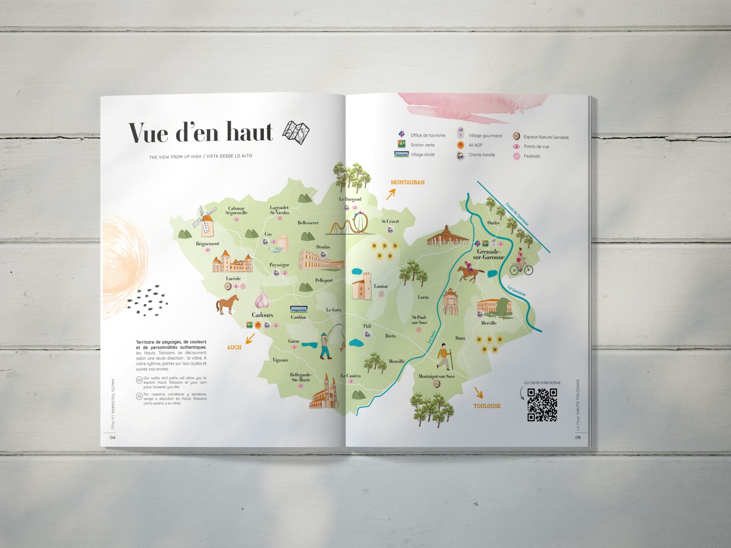 Sur la base de la maquette que l’office de tourisme des Hauts Tolosans avait validé en amont, nous avons décliné l’ensemble du magazine en restant fidèles aux attentes de départ : faire ressentir l’ambiance authentique du territoire et mettre en avant l’humain au travers de rencontres et de portraits. Au fil des pages, le lecteur part à la découverte de paysages, d’histoires et de personnalités locales qui font de la brochure un magazine touristique convivial et vivant, à l’image de la destination.